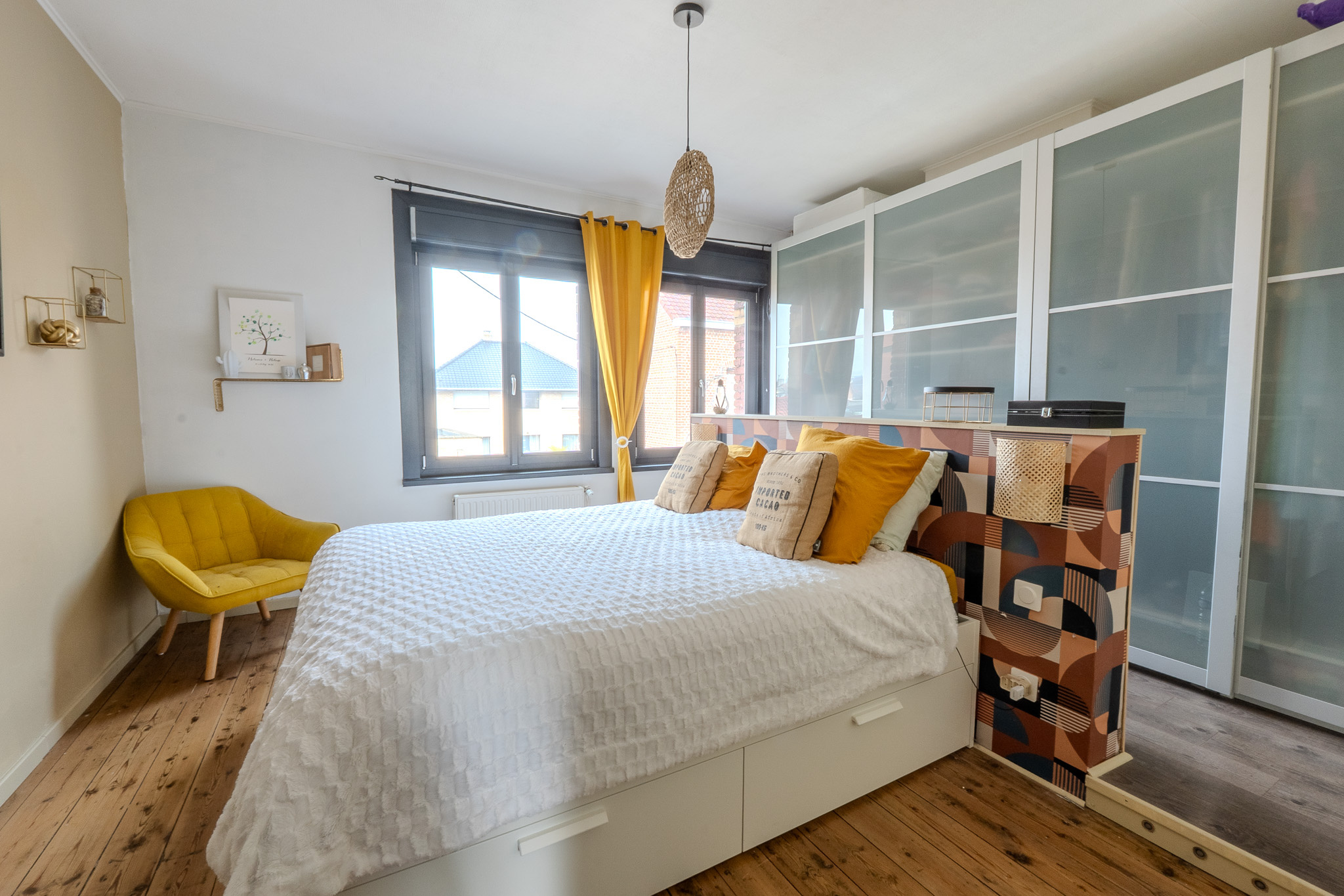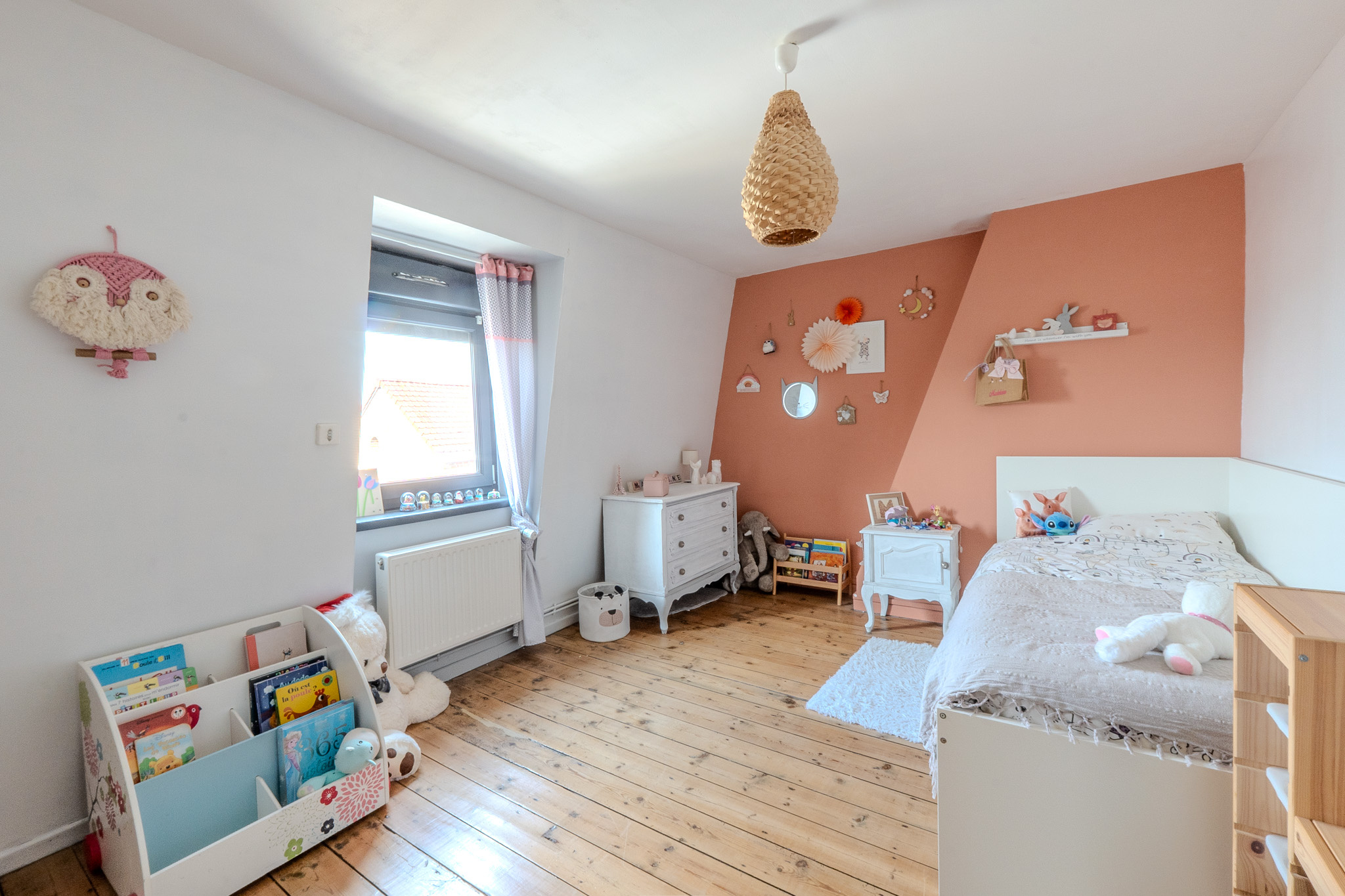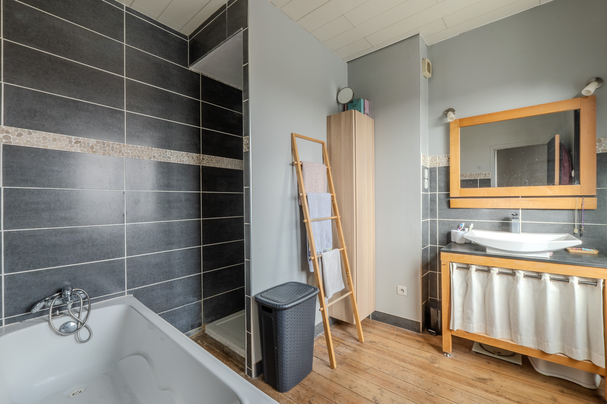 Aux étages, vous trouverez 3 grandes chambres pleines de charme avec leur plancher d'origine et une salle de bain avec baignoire et douche.