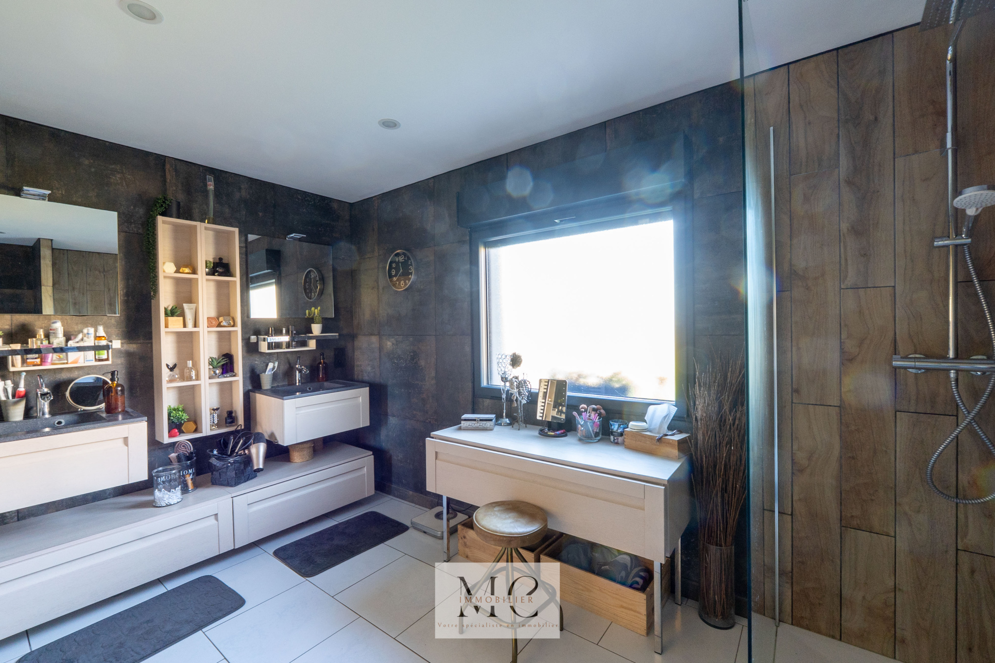 Côté pratique : grand garage de 30 m², cellier, chauffage par pompe à chaleur.