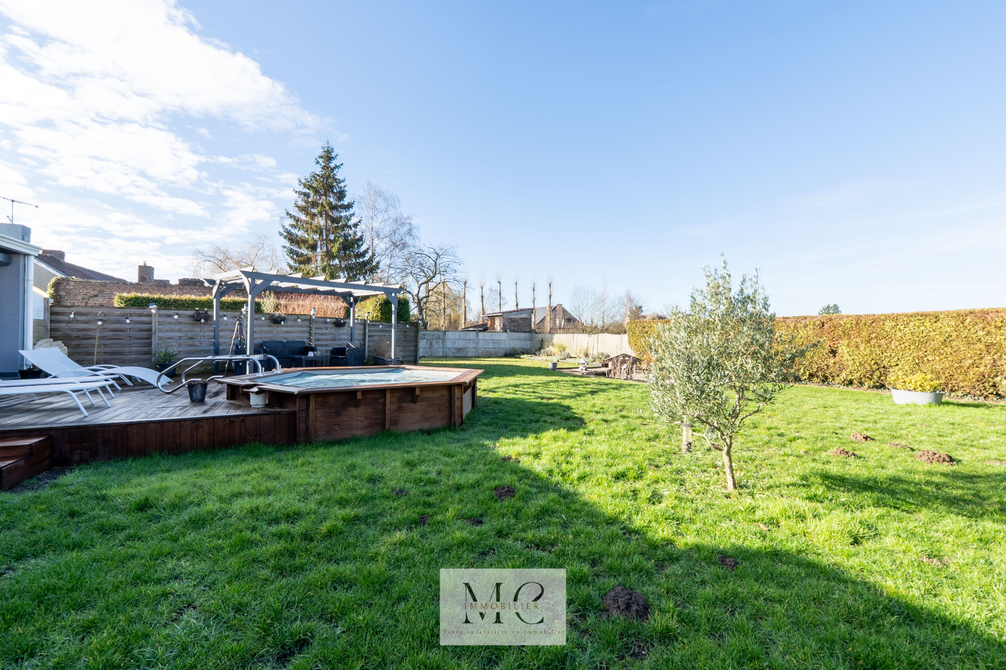 À l’extérieur, profitez d’une belle terrasse avec piscine, donnant sur un jardin sans vis-à-vis.