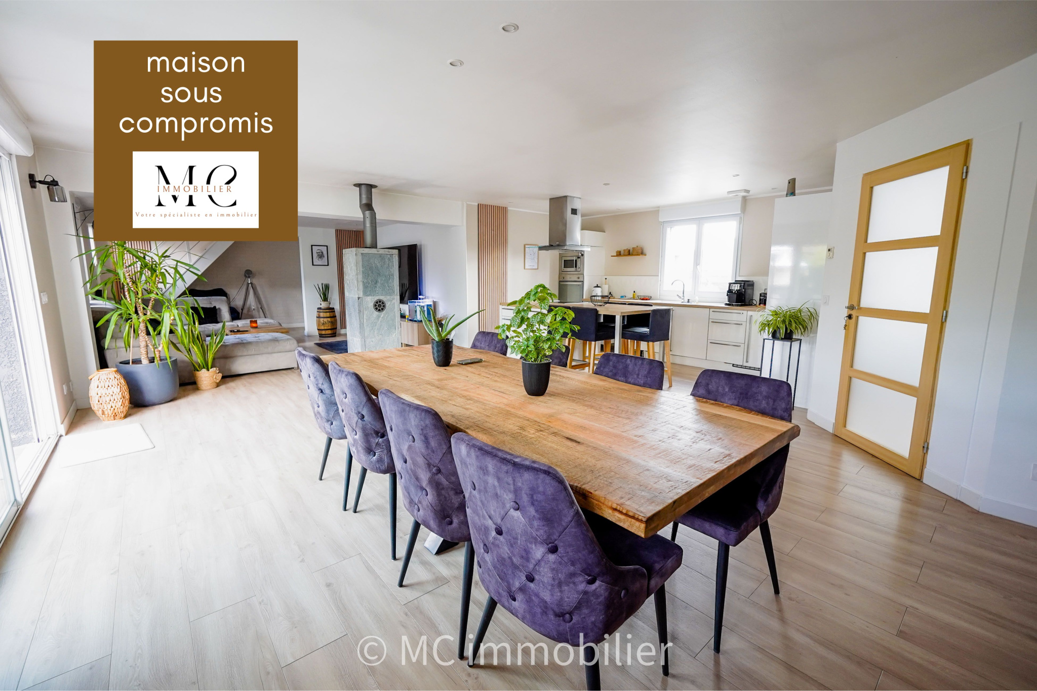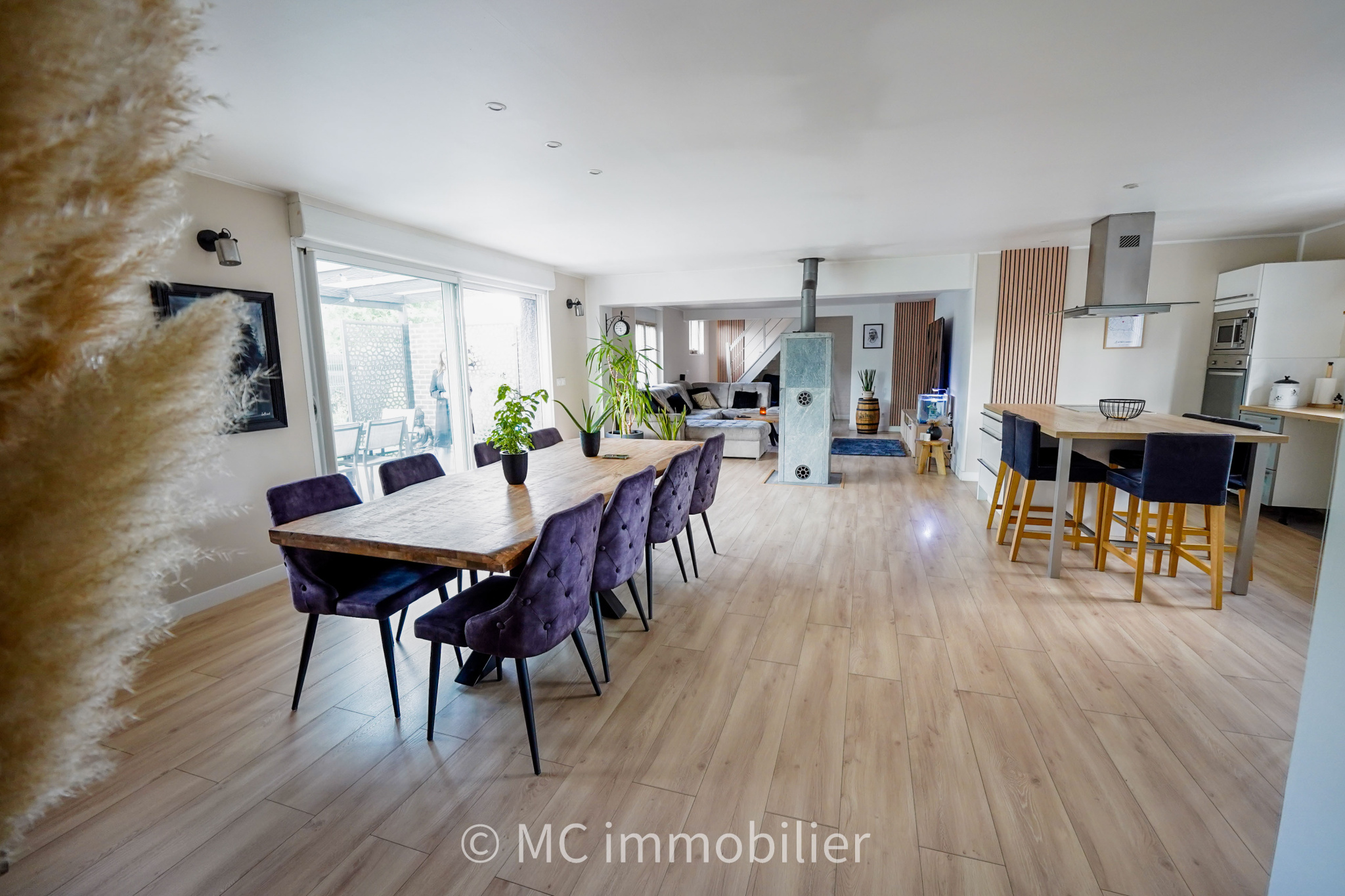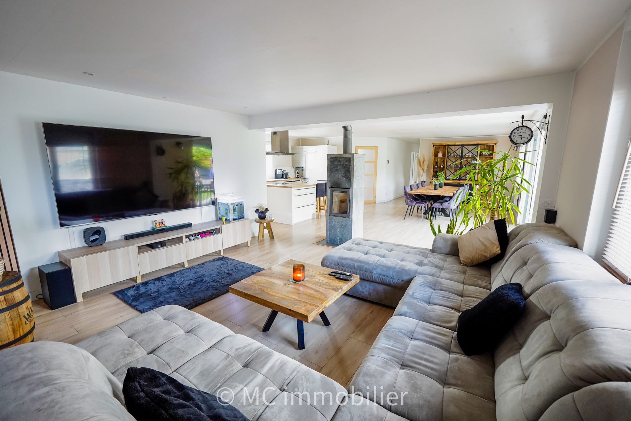 - une spacieuse pièce de vie de plus de 63 m² avec cuisine équipée et un poële à bois.